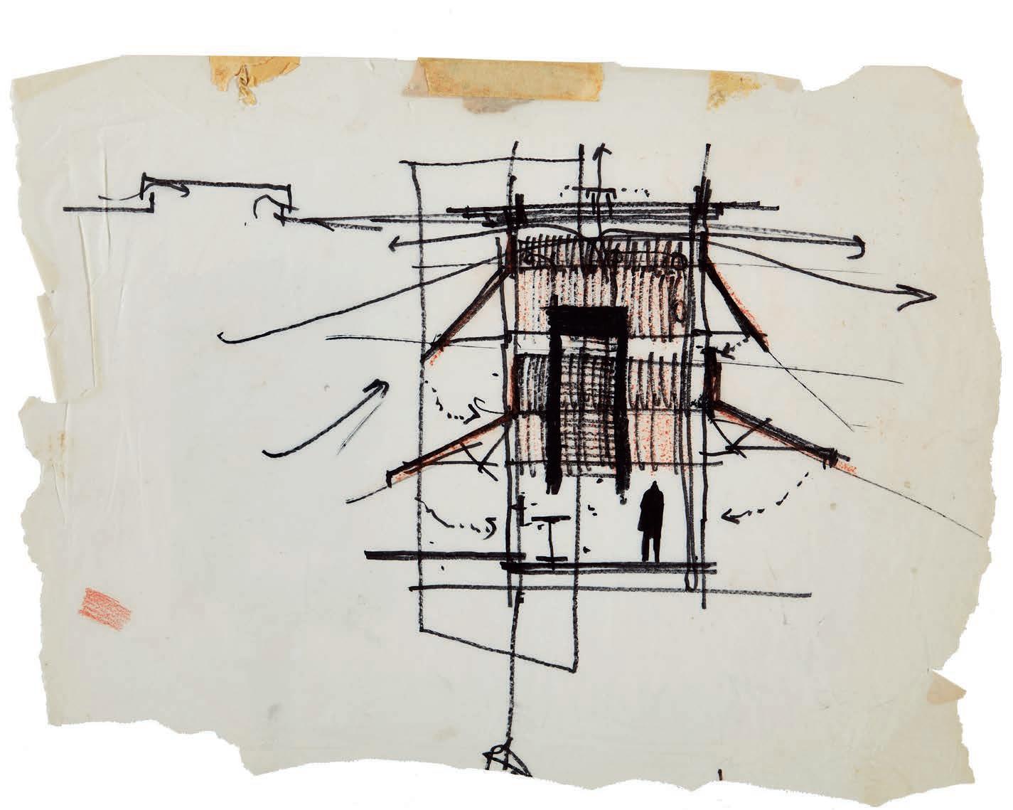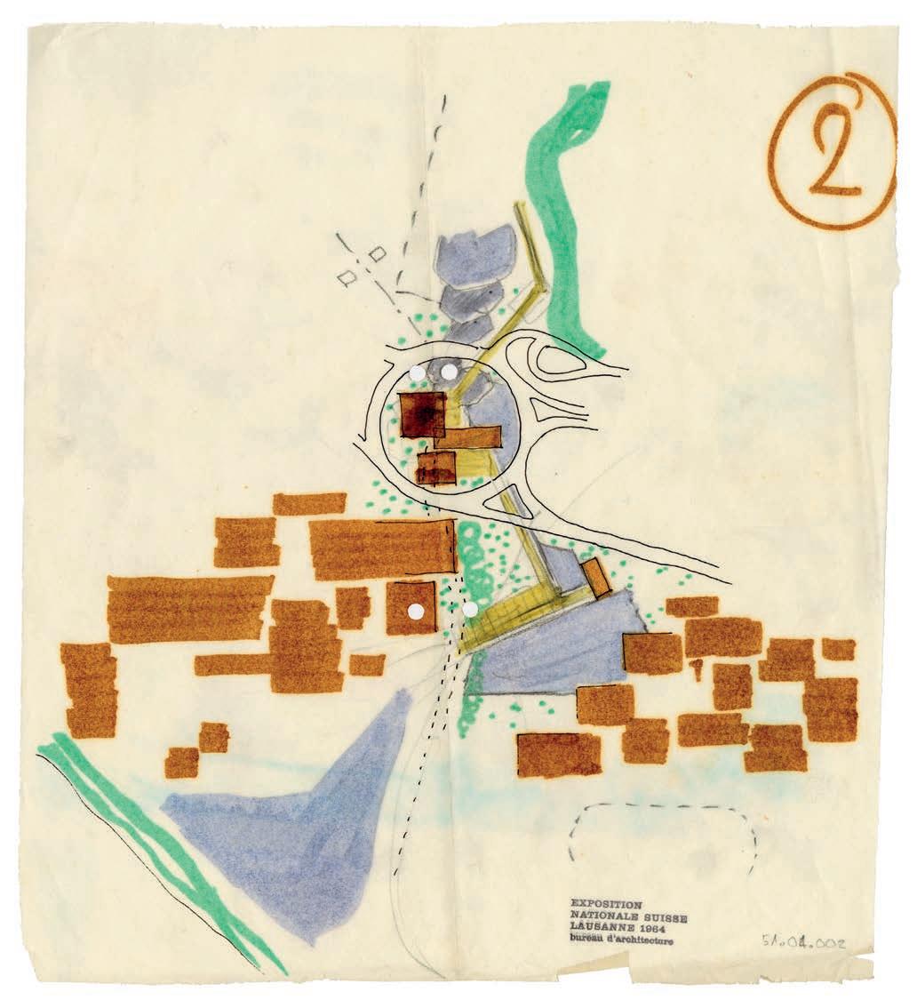 Alberto Camenzind, plan,La Voie Suisse, Expo 64, Lausanne, 1961. Pencil, black felt-tip pen, and marker on tracing paper, 325 × 285 mm (Acm-EPFL)
