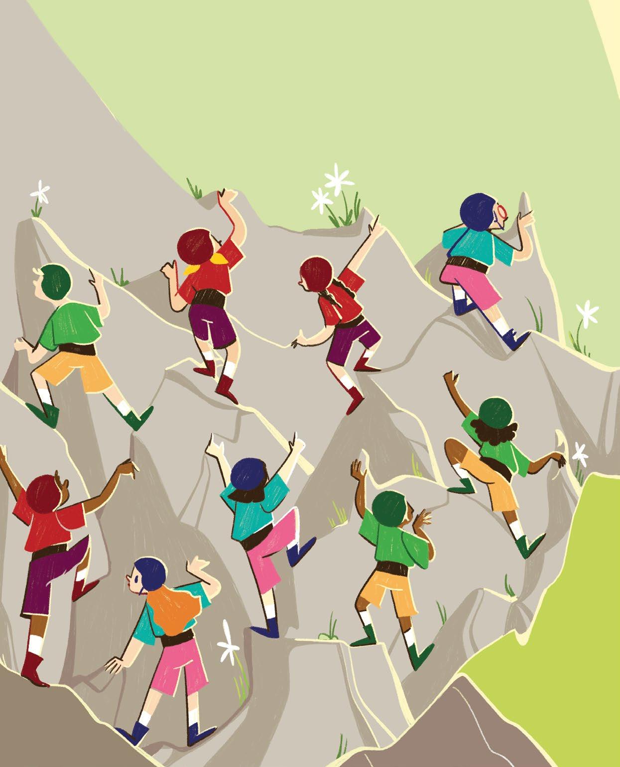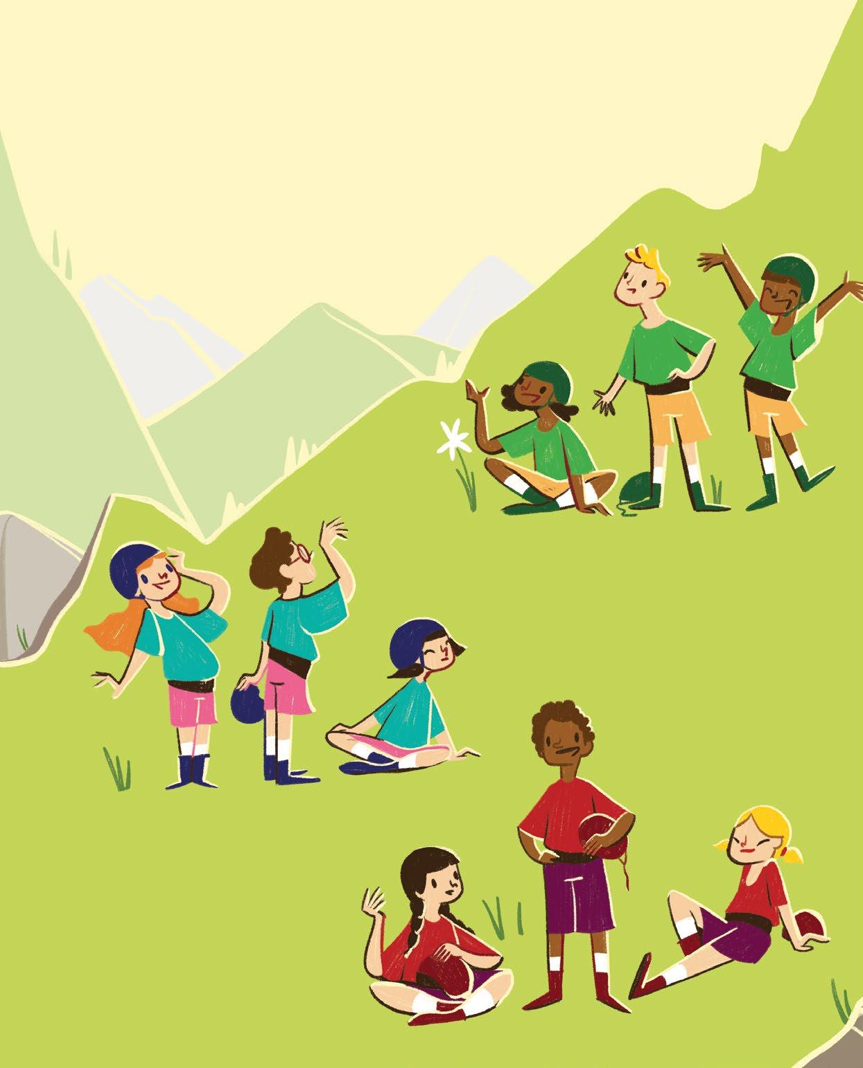 In life, it’s important to have friends to experience both difficult and beautiful moments with. These three groups of kids are climbing a rock face. CONNECT all the kids in the same group with the rope, starting from the top.