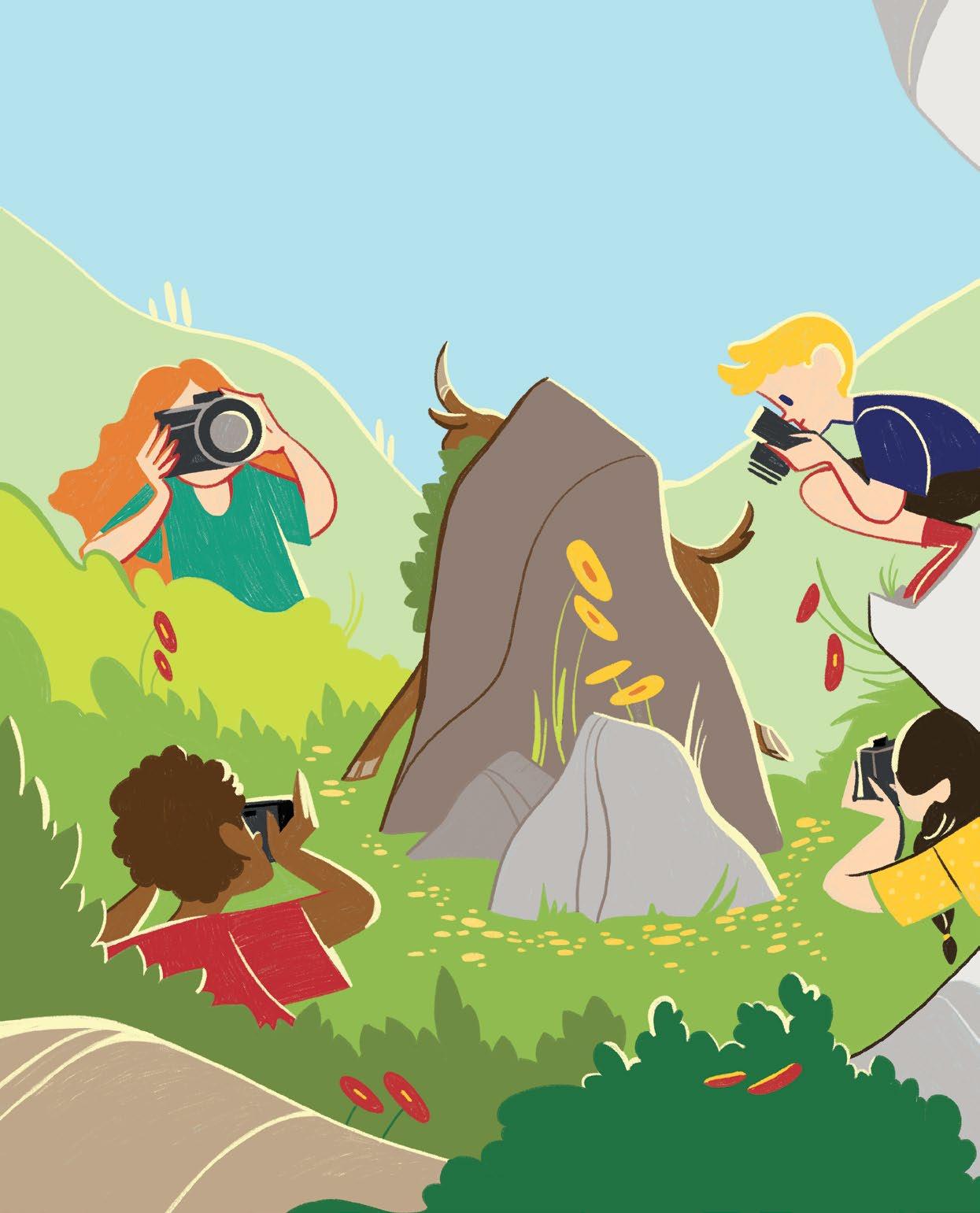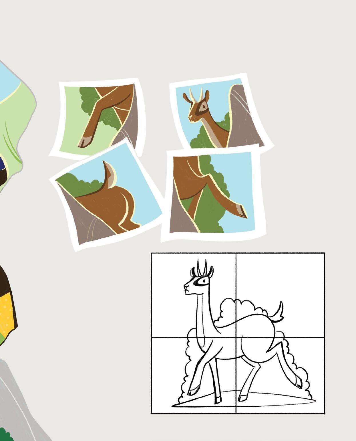 What kind of animal do you think it is? Let’s FIND OUT ! COLOR the frame of each photo with the color of the shirt worn by the kid you think took the photo: that’s their point of view. Then WRITE the number of the corresponding photo on the drawing. Finally, COLOR the drawing and find out which animal is behind the boulder!