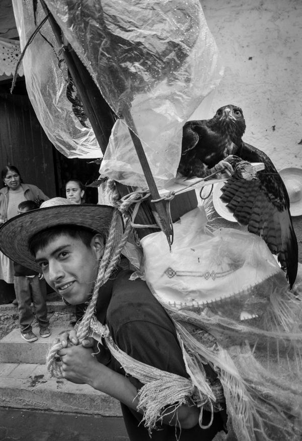 llamado “Santoniño”, se coloca un enorme poste frente a la vivienda donde se encuentra la imagen santa. Este poste, donde se cuelga una estrella de Belén, proviene de un pino cuidadosamente elegido del bosque, al cual se lleva música y comida antes de ser talado. Cada armatoste requiere el trabajo de decenas de hombres, que reciben comida y bebida a cambio de su esfuerzo. Como ya lo he dicho: la fiesta se compone de fiestas menores. Uno de los armatostes más sorprendentes se llama katárakua. Es una cruz de madera parecida a una X que se carga en la espalda. La katárakua se adorna de panales silvestres y animales vivos como águilas, serpientes, zorros, ardillas o cualquier animal encontrado en el bosque. Cada “panalero” carga su katárakua en la espalda y