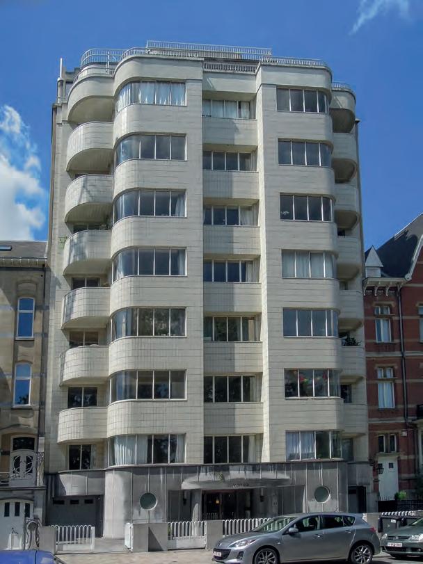 Let’s continue our walk to avenue Émile Duray. This avenue, which extends along La Cambre Abbay, was built for the World Expo of 1910 at Solbosch. The buildings along it all date from the interwar period and include several Art Decoinspired town houses: No. 4: 1928, Fernand Petit; No. 6: 1924, arch. Adrien Blomme; No. 12: 1925, arch. Michel Polak; No. 14: 1925, arch. Fernand Petit; No. 18 and No. 20, 1924, arch. Adrien Blomme.
