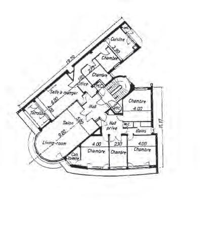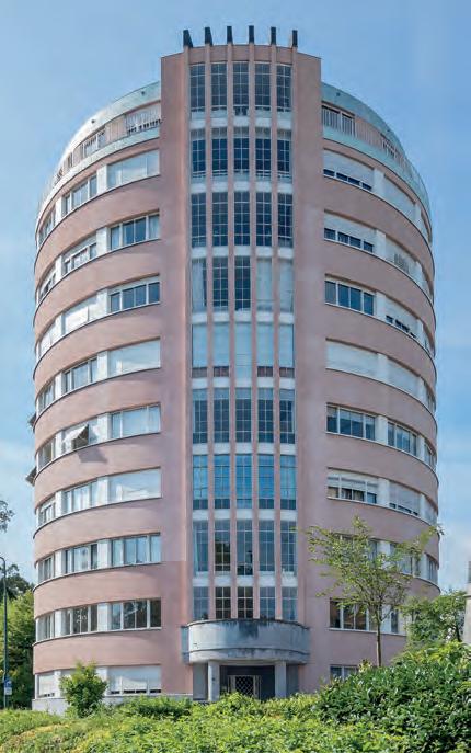 with porthole-shaped windows is reminiscent of an ocean liner. At the time, writers extolled the qualities of this building, its location, its layout and its beautiful finish.1 The building, which is proportionate to the open space in front of it, had a lovely view of the ponds. Authors were unhappy about the many apartment buildings with multiple floors that were being built in secondary, narrow streets. There was an apartment on every floor of this building, with a floor area of 200 m2, divided into three separate zones: the living and its rotunda in the centre, which was separated from the dining room with terrace by a wide glass window, with the study, the kitchen and two maid’s rooms at the rear. To the right of the entrance, a separate hall led to four bedrooms and two bathrooms for the apartment’s owners. So there was a clear division between the reception rooms, the private rooms of the owners and the realm of the domestic help. The structure of this building, made entirely out of reinforced concrete, meant that the architect did not have to stick to this fixed layout and was able to alter the spaces.