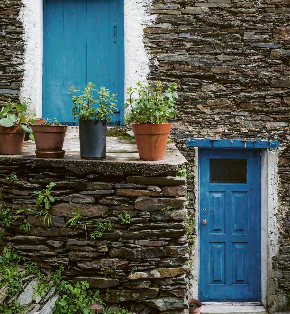 ABOVE AND LEFT: The slate walls of Piódão seem dark and austere except for the moss and herbs pushing through narrow gaps in the stone. Brightly painted doors and windows are a source of variation.