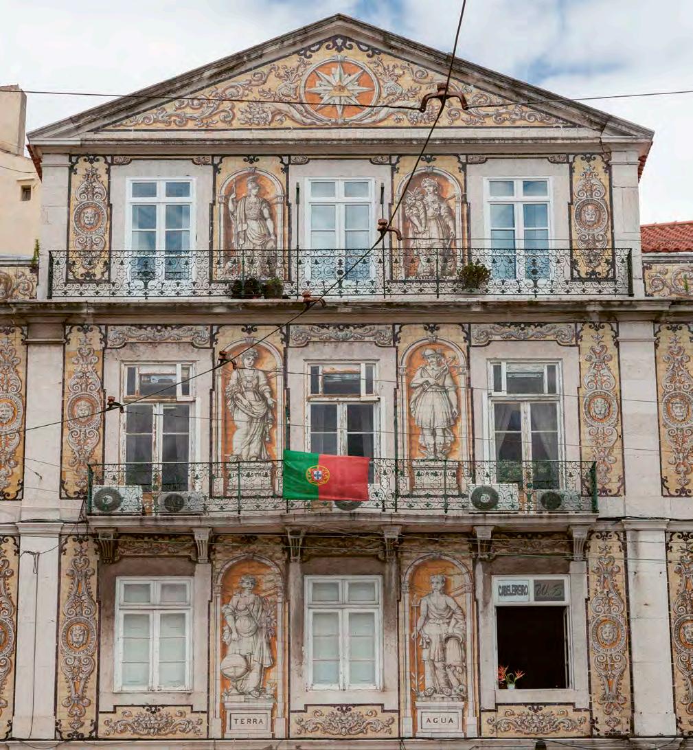ABOVE: Azulejos on the façade of Casa do Ferreira das Tabuletas create the illusion of three-dimensional statues. Not carvings, the allegories were hand-painted onto the tiles by the artist Luís Ferreira.