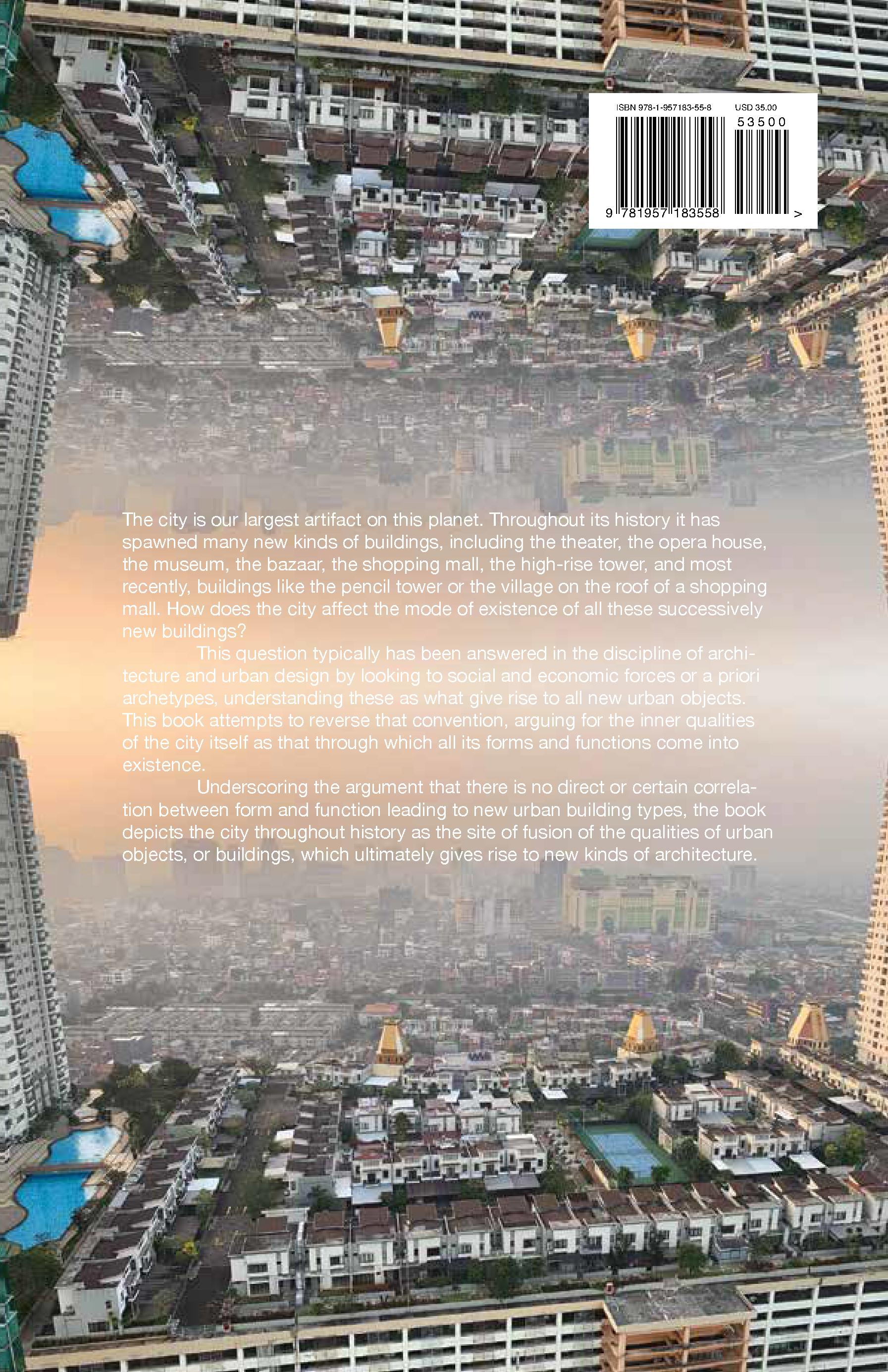The tradition within architectural history that identifies the city as the origin of our buildings poses a challenged to us, as architects, to theorize about the city’s form and use in order to rationalize our own actions. This book responds to that disciplinary challenge. In opposition to other disciplinary approaches to the city and its architecture, however, I do not argue for type (Rossi, Ungers) as the deepest aspect of the architecture of the city. Neither do I use the function (Venturi & Scott Brown, Koolhaas) of the city to explain its material organization, nor consider matter (Jacobs, Banham) to be deeper than the real city. Instead, I argue that the mode of existence of architecture is inherent to the city itself, which originates its architecture as part of its being as a technical object.