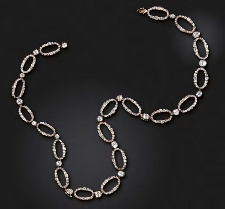 Early 19th-century diamond necklace dismantling into a set of three bracelets composed of oval openwork diamond sections with single cushion-shaped diamond connections, c.1825.