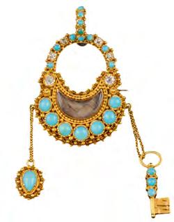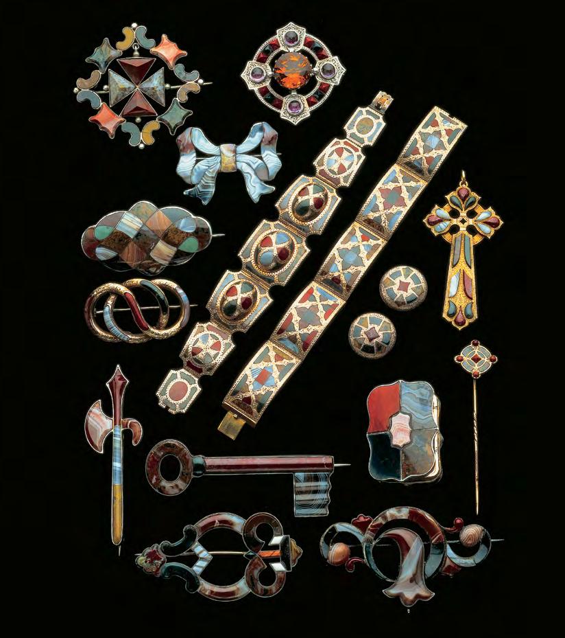 Scottish jewellery in gold and silver mounts. Condition is a critical issue since missing hardstones are extremely difficult and costly to replace. Novelties such as keys and axes or accessories such as the vinaigrette at lower right are rare and desirable today.