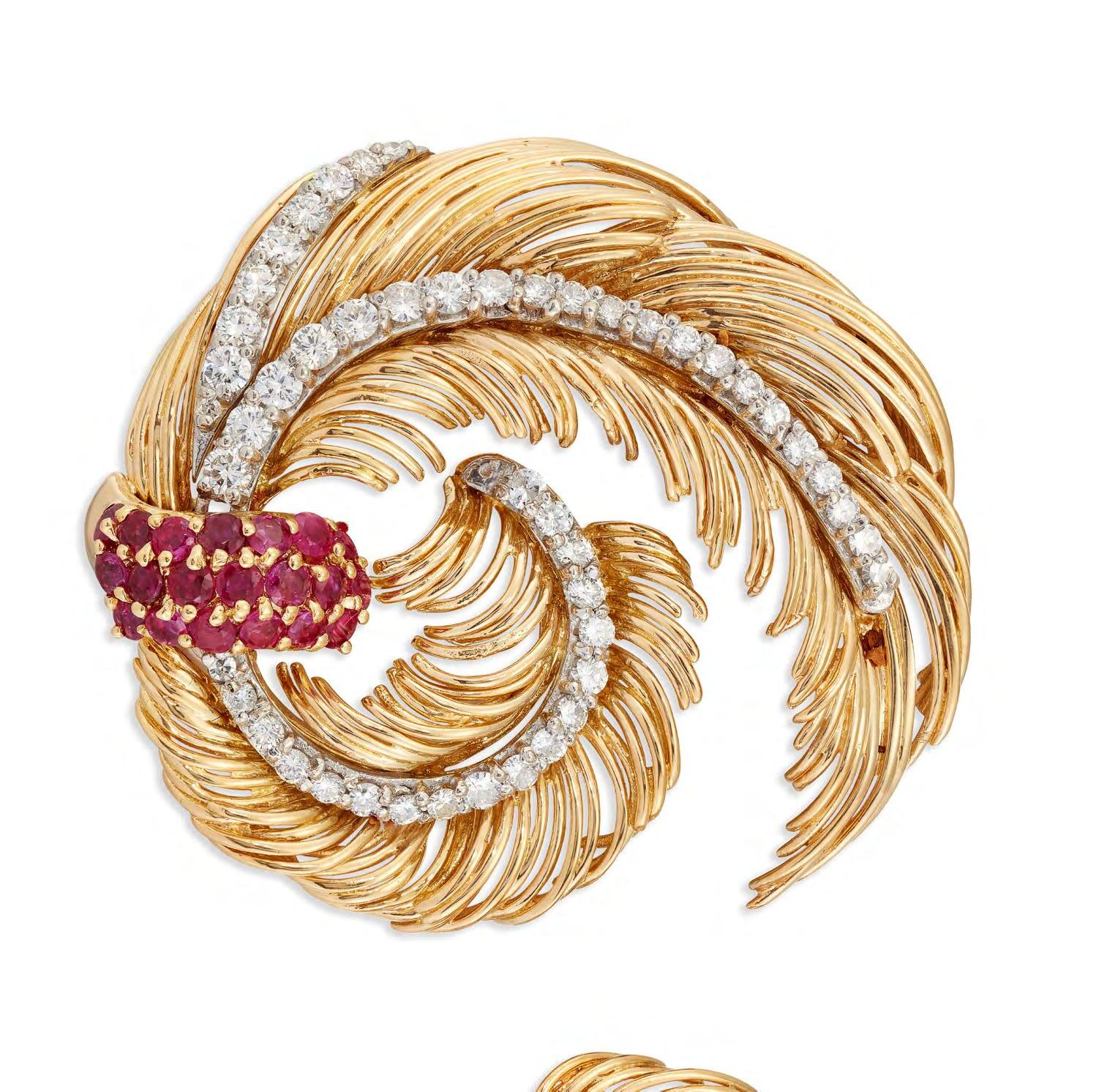 Kutchinsky gold, ruby and diamond coiled wirework feather brooch and matching earrings, London 1963. Kutchinsky excelled in this kind of delicate naturalistic jewellery in the 1960s. Rubies and diamonds were always a popular choice as well as other interesting colour gem combinations such as rubies or sapphires blended with clusters of turquoises.