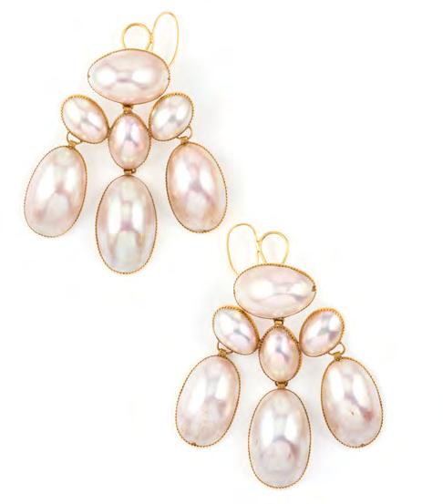 Pair of 18th-century ‘Coque de Perle’ girandole earrings, c.1760. ‘Coque de Perle’ was an effective imitation of natural pearl. It was composed of a curved mother-of-pearl veneer filled with a composite material to provide stability and backed with a further flat section of mother-of-pearl.