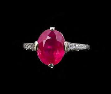 Opposite page: A fine and rare graduated two-row natural pearl necklace by Boucheron, ranging in size from 8.0mm to 2.6mm on an old-mine marquiseshaped diamond and platinum clasp, c.1910. Centre: Fine Cartier Burmese ruby ring, c.1905, the oval-shaped ruby weighing 3.30 carats on a platinum hoop with five diamonds set on each shoulder.