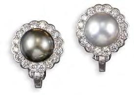 Pair of white-gold earclips mounted with white and black cultured pearls in diamond surrounds, c.1970.
