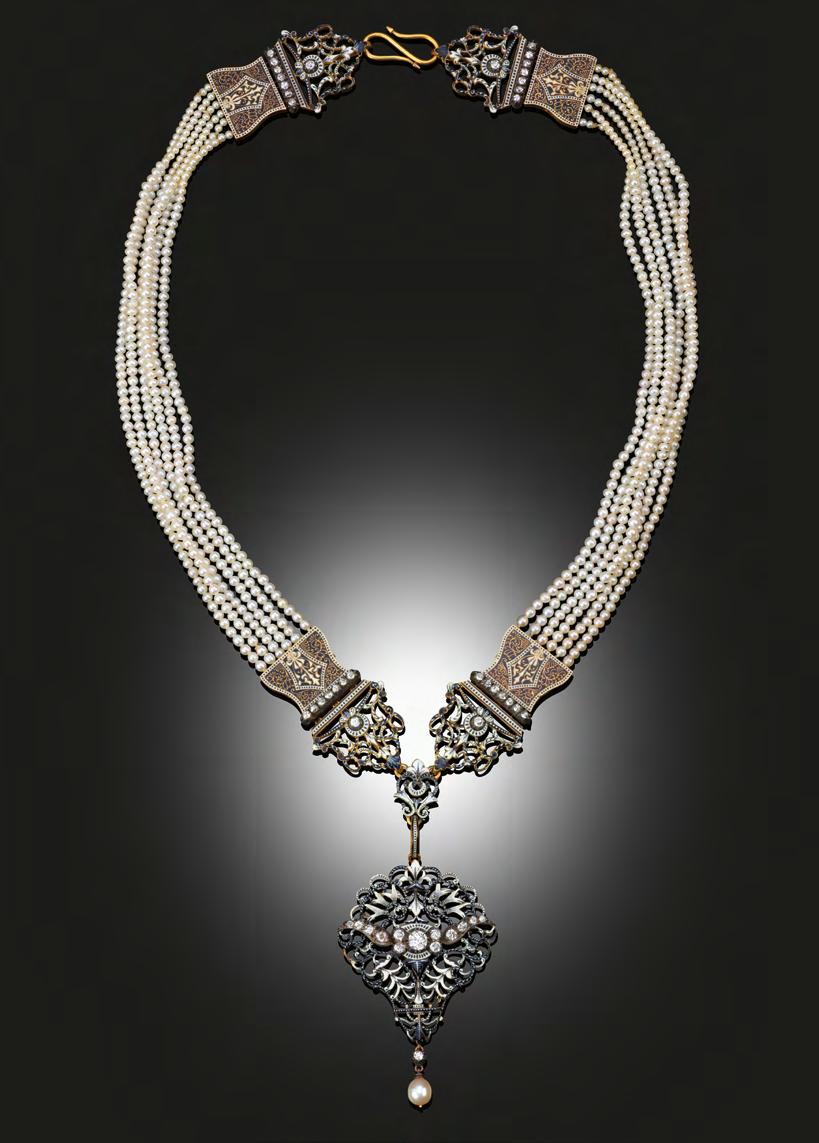 Opposite page: Elegant gold necklace by C. & A. Giuliano composed of six rows of natural pearls with diamond-set black and white enamelled arabesque panel sections extending to scrolling enamelled openwork finials and suspending a matching diamondset enamelled pendant with pearl drop, c.1895. The Giuliano workshop specialised in this kind of intricate gold work featuring monochrome enamelling, often set with subtle understated coloured gems such as zircon and chrysoberyl.