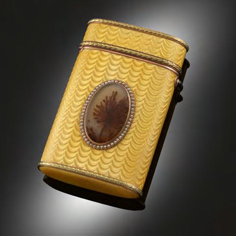 Fabergé two-colour gold cigarette case, c.1910, of rectangular oval section decorated with translucent yellow enamel on a wavy guilloché ground and set to the centre with an oval moss agate plaque set in a border of seed pearls;