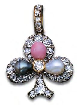 Pink conch pearl, black and white natural pearl and diamond ‘Ace of Clubs’, c.1885.