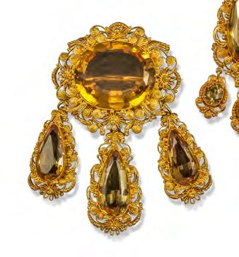 A variety of crystalline quartz ranging in colour from the palest lemon through orange and brown, citrine has been used extensively in 19th- and 20th-century jewellery and ornamentation due to its abundance and modest value� The stone is often confused with topaz, but citrine lacks the brilliance of topaz and, when examined under a magnifying lens, often exhibits varying patches of colour Citrine was widely used in gold and silver necklaces and bracelets and was so popular in Victorian Scottish jewellery that it was known as ‘Cairngorm’ Early Victorian desk seals were sometimes made with faceted citrine handles which are desirable today; however, care should be taken to ensure that what is thought to be citrine is not actually paste Like amethyst, citrine was popular in the 1940s and 1950s when large, rectangular stones in contrasting shades of yellow, gold and brown were set into architectural mounts