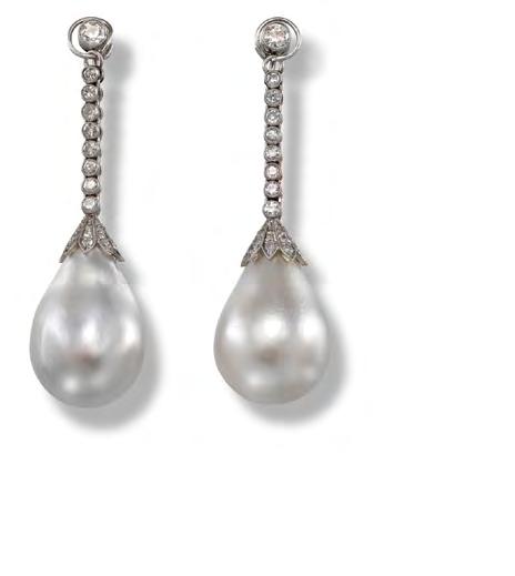 Pair of drop-shaped Oriental pearl, platinum and diamond earrings, c.1910. This pair of earrings was sold at auction in 2012 by Woolley and Wallis at the very peak of the market for natural pearls. Perfectly matched and possessing excellent provenance they soared above their pre-sale estimate to fetch an extraordinary £1.6m.