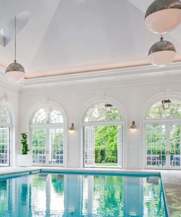 PREVIOUS PAGE: An expansion of the house coincided with its modernization, and this new construction includes a family room whose exposed structure and wood interior cladding lend warmth and coziness to the soaring volume. RIGHT: A wood-beamed natatorium is located on the east side of the house, at grade. Its roof serves as a deck for the main floor’s common rooms.
