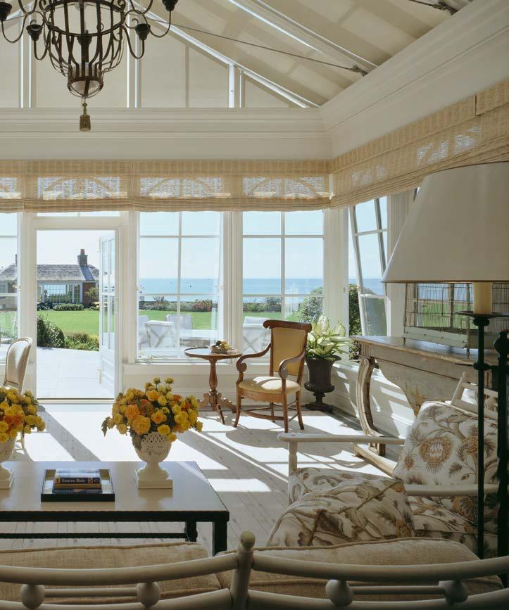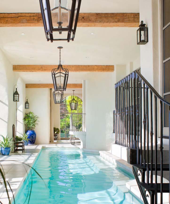 PREVIOUS PAGE: An expansion of the house coincided with its modernization, and this new construction includes a family room whose exposed structure and wood interior cladding lend warmth and coziness to the soaring volume. RIGHT: A wood-beamed natatorium is located on the east side of the house, at grade. Its roof serves as a deck for the main floor’s common rooms.