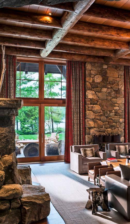 The interior expression of massive granite and timber differentiates the project from Castle in the Clouds, whose rooms are finished more delicately. OVERLEAF: A firepit and multiple seating areas encourage guests to enjoy outdoor living on the 9-acre (3.65-hectare) lakefront property.