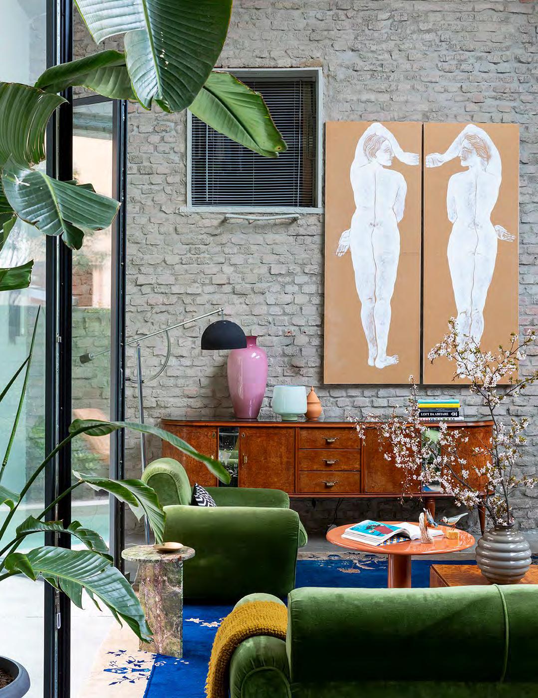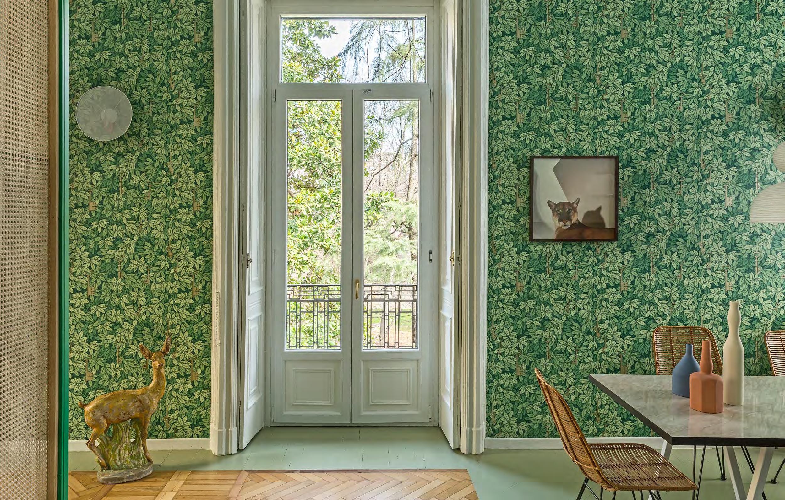 The homes in this chapter all focus on using decoration to bring nature into indoor spaces. Some homeowners have chosen to express their connection to nature by using wallpaper, often featuring oversized leaves and flowers, while others use colour or organic shapes. Regardless of the chosen solution, these homes are always bright and airy, with considerable effort made to allow natural light in. There are numerous interpretations of decorating with nature, like artist Sofia Cacciapaglia, who has adorned her walls with a magical field of flowers, painted in her style on recycled cardboard boxes. Whatever your taste might be, nature is always welcome in the home.