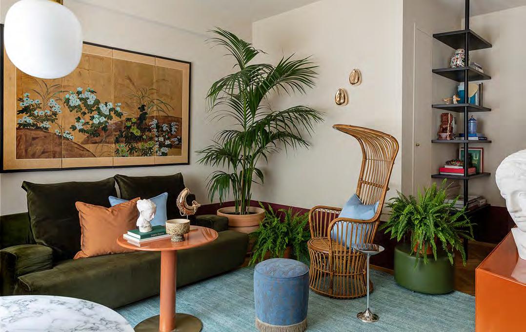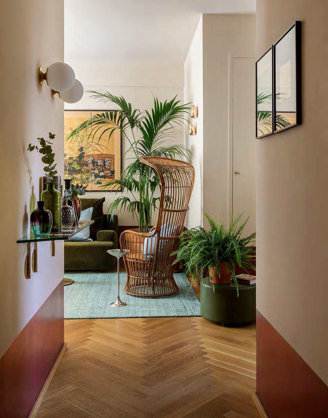 ‘With this project, we have officially entered the world of interior design,’ the couple proudly comments. ‘It all started from an old office on the first floor of a 1970s building, located a short distance from the Monumental Cemetery. It has all the charm and is in a strategic position between the Isola and Garibaldi districts, so it’s super-connected to the city centre. Initially, we were looking for something that could be redone from scratch, possibly on a higher floor, perhaps even with a small outdoor area. But then unexpectedly, during the site inspection, these rooms won us over for the natural light that generously entered from the large windows.’ The entire floor plan has been reimagined, and although it is only 50 square metres, the couple has created a beautiful and functional contemporary home. The one-time executive office is now a spacious living room, and the storage room is now a small kitchen and a bedroom. The only space left in the original position is the bathroom, which underwent a major restyle. Bringing some nature into the well-lit rooms was important for the couple, who both hail from coastal regions with often immediate access to nature. They aimed to introduce as much greenery as possible into their home. Francesco and Christian find delight in the artful fusion of vintage pieces and modern creations. Their design ethos seamlessly blends classic elements with exotic details, drawing inspiration from the Bauhaus movement and the teachings of influential masters. Gio Ponti and Ludwig Mies van der Rohe are among their favourites. Their artistic influences extend beyond borders, incorporating elements from China and Morocco, a testament to the cultural richness gathered from their travels in the quest for fresh inspiration.