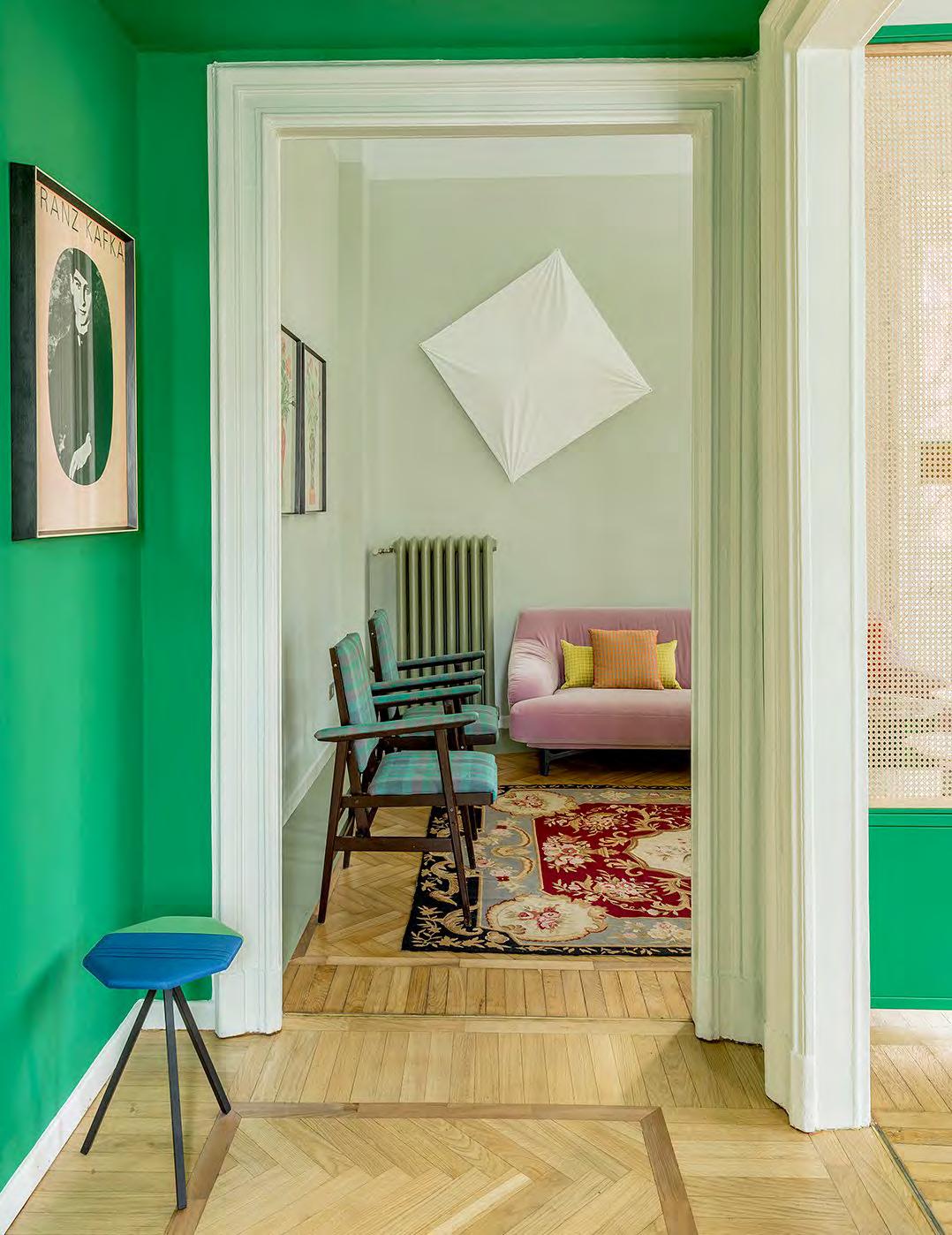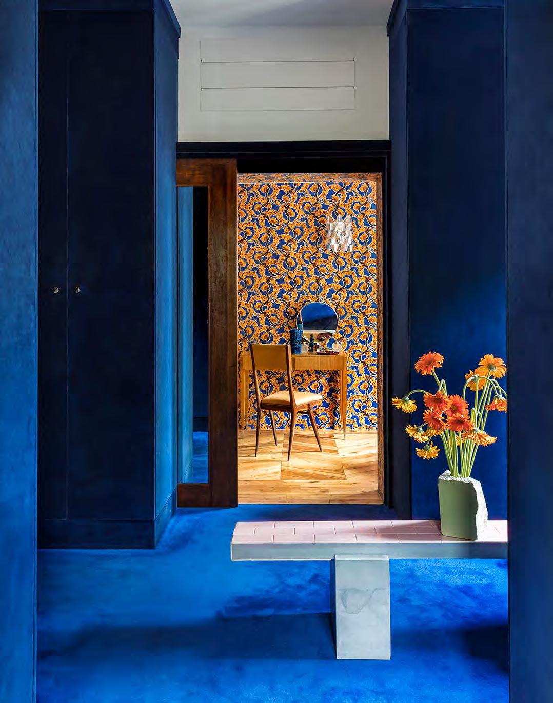 It might be a house in the country, but once inside, it certainly is not your typical rusticfarmhouse. Samuele enlisted the talents of Margherita Bacci and Cosimo Bonciani, two young architects who were just 25 years old at the start of this project. With the backing of Florence-based architectural firm Studio1 Architetti, they undertook a thoughtful and comprehensive renovation. The result was a significant transformation, breathing new life into the home environment while respectfully preserving its original structure. The interiors are fresh and contemporary, with bold choices of colour and pattern. The architects explain: ‘We were committed to obtaining a very clean and linear scenography, from the choice of floors, with hand-nailed herringbone parquet or reclaimed floor tiles, to the walls and wooden beams, completely painted in white. In this way, the rich and colourful art and modern antiques in Samuele’s collection stand out harmoniously, avoiding unwanted overlaps.’ Constructed in 1721, the home is developed over three floors, where the ground floor has a dual use: on one hand, it is a welcoming space for guests; on the other, it is an intimate zone, with the study rooms and the kitchen, the latter with independent access. The first floor is Samuele’s personal suite, a place dedicated to privacy where he can disconnect from the world. Here, too, the rooms are built as a succession; linked by the colour blue, they are tinged differently in the bathroom, the boudoir (with a precious wallpaper from the 1930s) and the sleeping area. Then there is the attic, dedicated to music and video, with a guest bedroom and a bathroom that hides a small bathtub under the roof. As Samuele explains, ‘The final effect is outstanding, since each room has a mood of its own. Looking out the windows, I see only countryside and tiny villages in the distance. It all creates a unique contrast: a villa that looks like something out of Palm Springs which is instead immersed in the Tuscan landscape.’