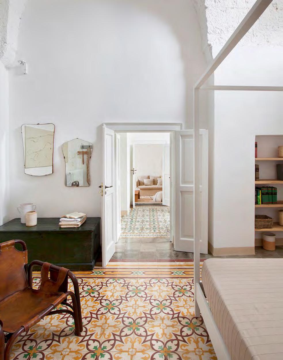The village of Patú, with its agricultural heritage evident in subterranean silos once used for wheat storage, served as the ideal canvas for the couple’s venture, with the manor itself standing in the grounds of an ancient underground olive mill. The couple’s vision for the manor materialised through a meticulous refurbishment process, preserving and celebrating its architectural legacy. The stables, now transformed into a living area adjacent to an open-plan kitchen and dining space, hold a special place in Daniela’s heart. ‘It’s our favourite room,’ she shares. The ground floor further unfolds with a second kitchen, a dining room for entertaining guests, a reading room, a cloakroom and the main bedroom. Upstairs, Zoltan’s bed, specially crafted by Zanaroli, fits snugly in a corner beneath the arching ceiling. The house exudes character, a testament to Daniela and Gianfranco’s commitment to maintaining its architectural richness. Fireplaces dating back to the 1600s grace the kitchen, while intricately patterned flooring in the main bedroom and reading room infuses vibrant hues of green, yellow and ochre. Original windows, strategically placed high on the walls, bathe the interiors in natural light, creating a bright and airy ambiance.