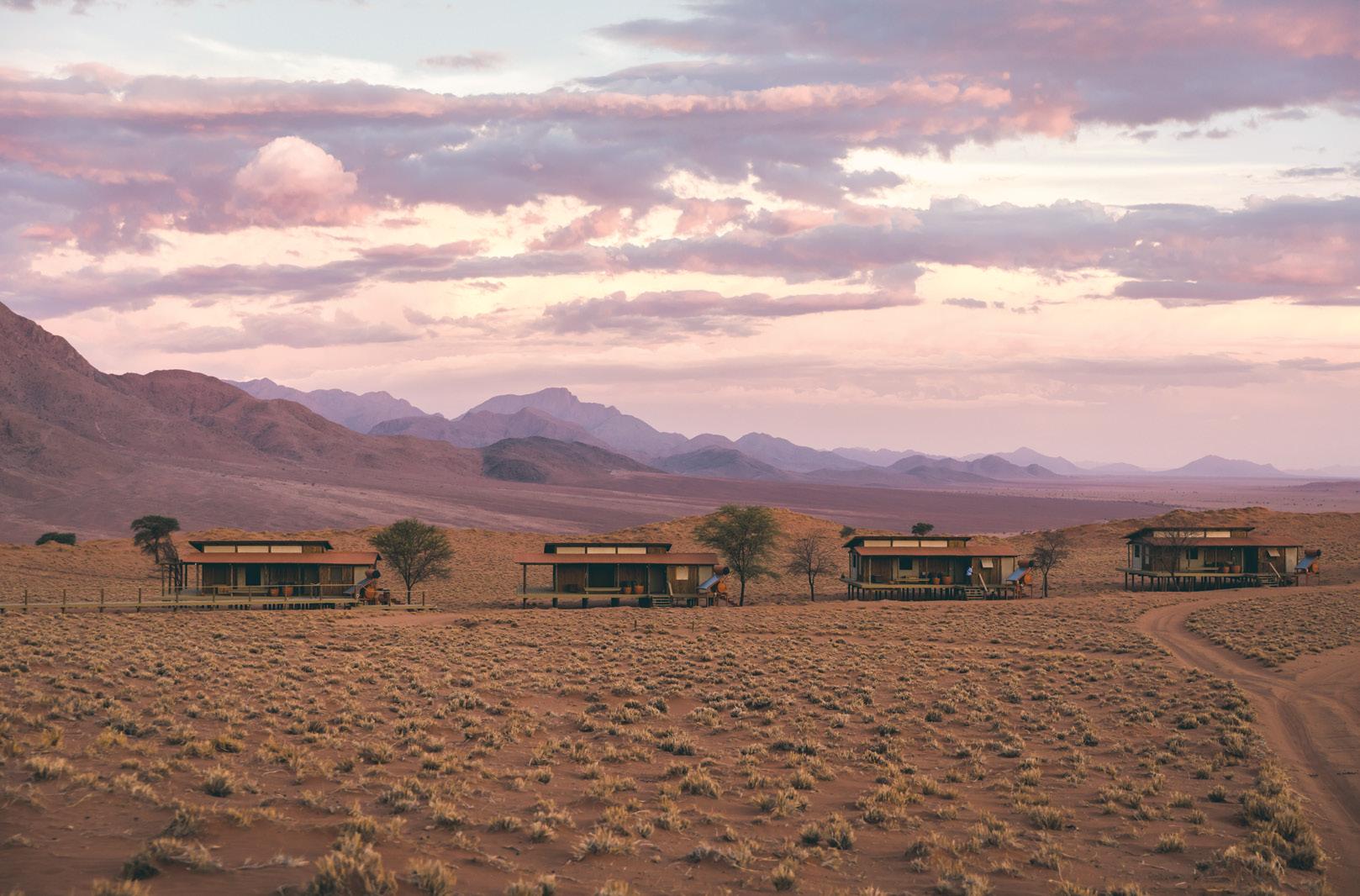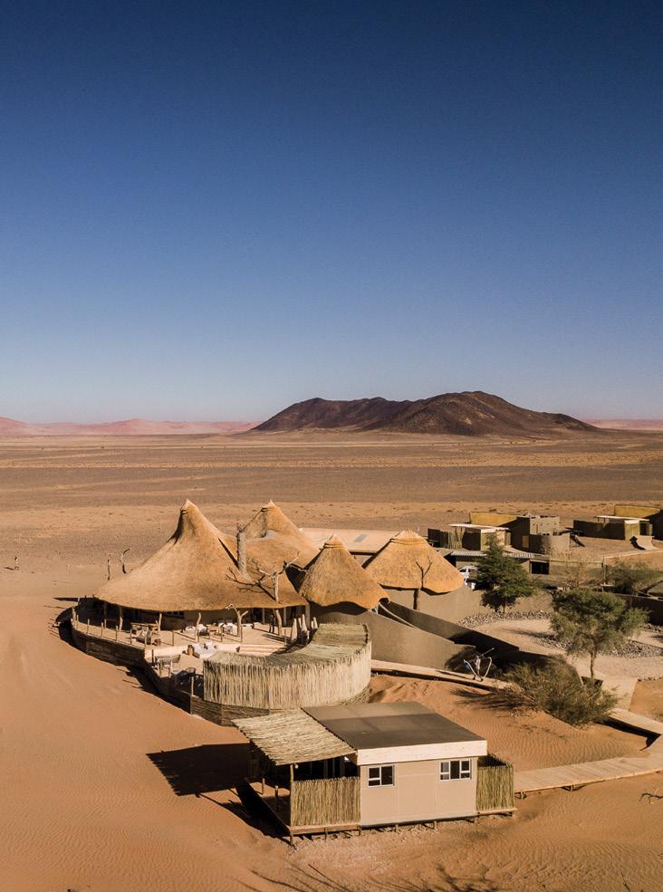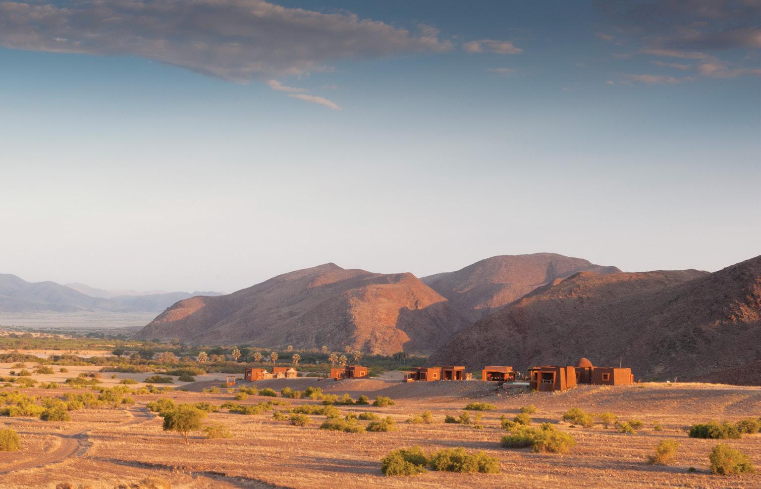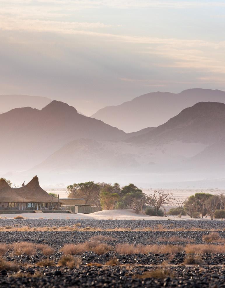 landscape and spot passing desertadapted wildlife such as ostriches, springbok and oryx, as well as the occasional brown hyena. Villas have private plunge pools and rooftop terraces that invite sundowners and stargazing or even (in the warmer months) a sleep out under the clear Namib sky. The elegant main lodge includes a library, wine cellar, craft boutique, dining area and lounge, and overlooks a watering hole popular with oryx, springbok and birdlife.