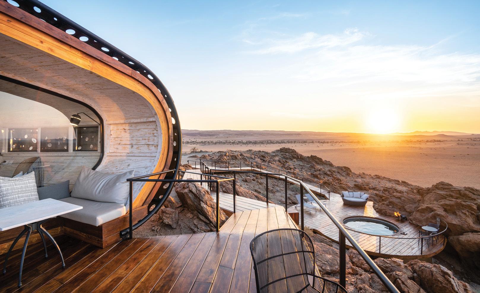 There’s seclusion and then there’s Desert Whisper, an intimate, oneof-a-kind desert hideaway for two. Resembling a spaceship that has touched down onto a rocky outcrop in one of the driest places on earth, this pod-shaped villa is one of just a handful of accommodation options in the private Gondwana Namib Park in the Namib Desert. Part of the sustainability-focused Gondwana Collection Namibia, it is perched above the desert sands in stark terrain about an hour’s drive from Sossusvlei.