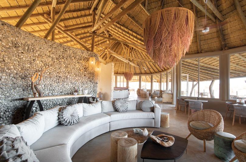 with your canvas blinds open for the soft sensation of the evening breeze and sight of the starstudded sky. A variety of communal recreation spaces offer plenty of options whether you’re seeking solitude or ready to mingle: there’s a spacious main area consisting of two lounges, several sundowner decks, a fireplace, a tea deck, a library, wine cellar and two dining rooms where you’ll enjoy mouth-watering meals accompanied by excellent wines. The sparkling swimming pool is suspended above the dunes behind the lodge with 360-degree views.