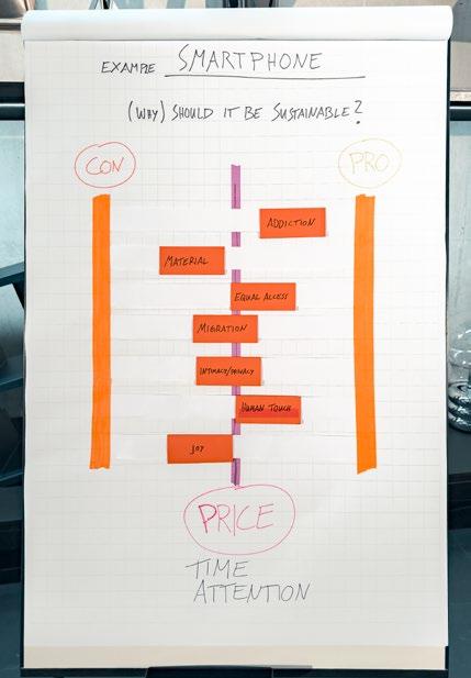 Die Diskussion könnte sich z. B. darum drehen, dass Smartphones nachhaltig werden sollten. Welchen Preis wären wir bereit, dafür zu bezahlen? Wäre es ein bezifferbarer Euro-Betrag, oder wäre es etwas Immaterielles wie Zeit, Aufmerksamkeit, Privatsphäre? Durch die Festlegung eines Preises wird eine abstrakte Diskussion greifbar.