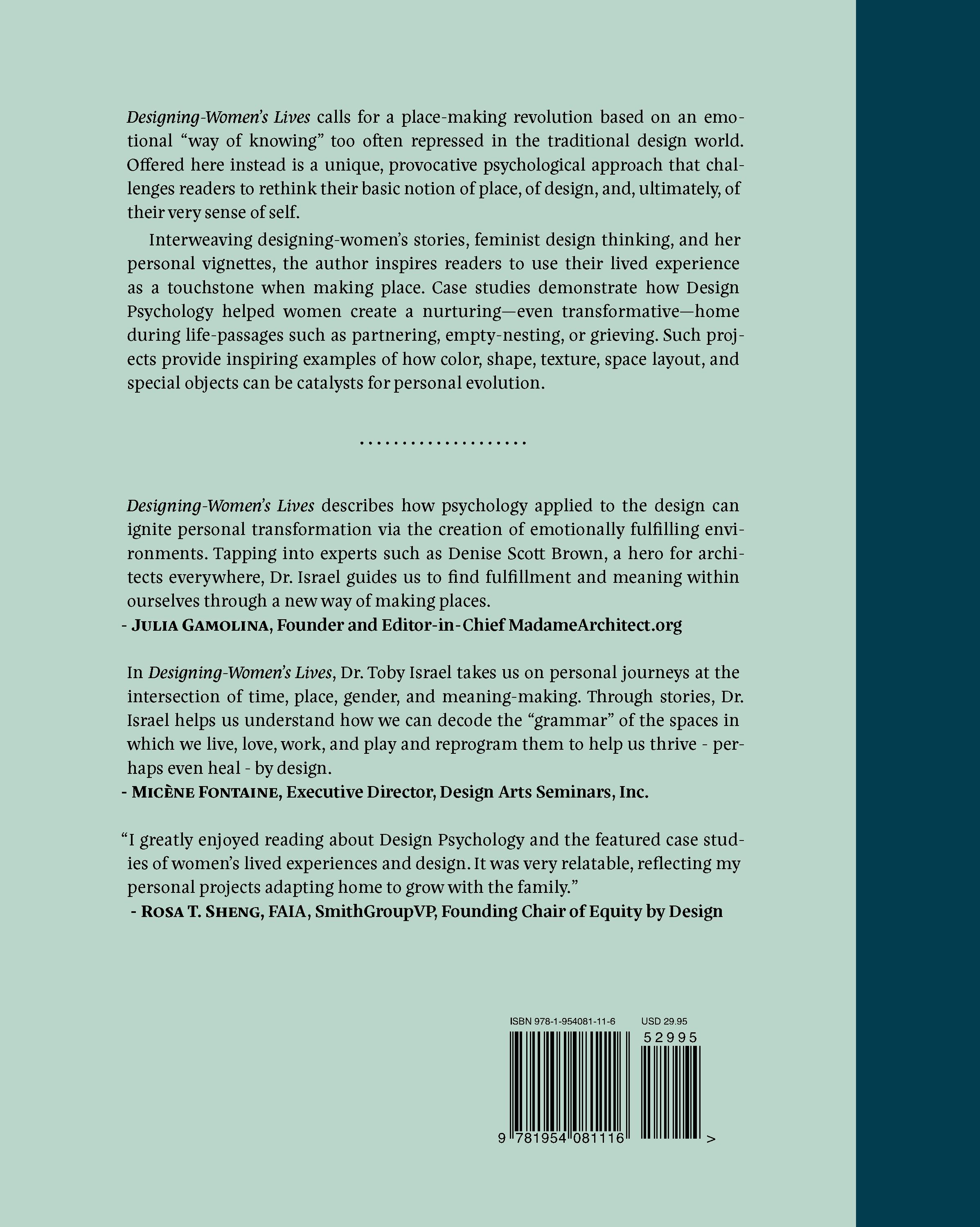 My questions about women and Design Psychology nagged at me, since I suspected that answers to them might have wider implications for creating place. I turned to writing this book as my quest to find answers and gain insight about designing-women, the psychology of design, and myself.