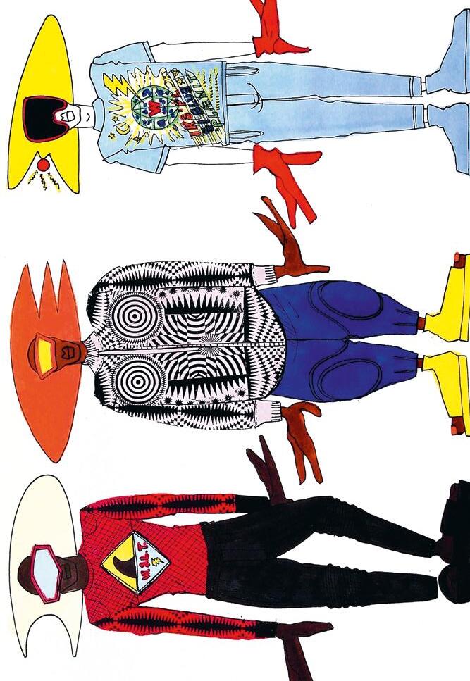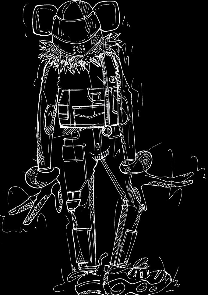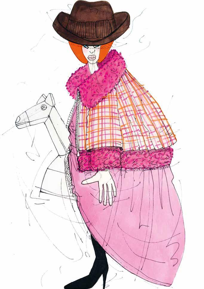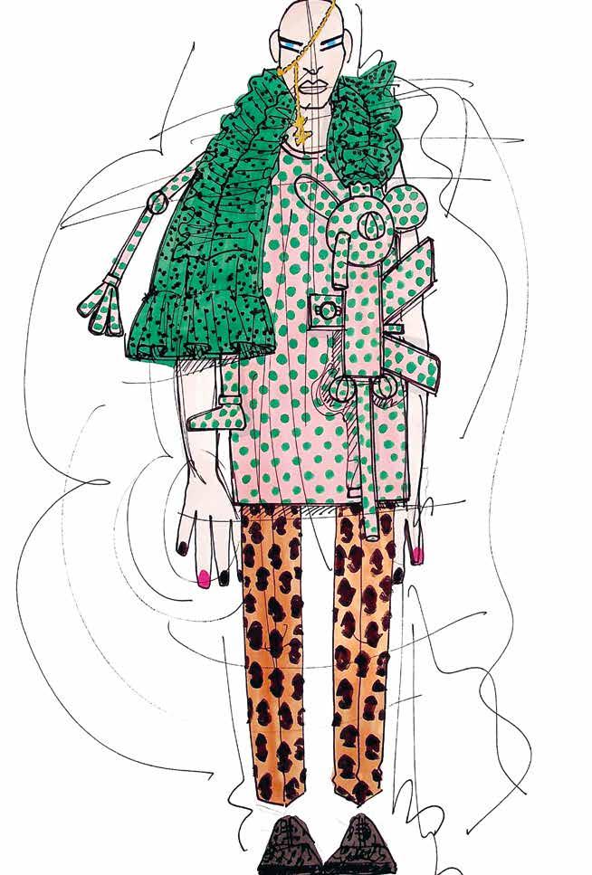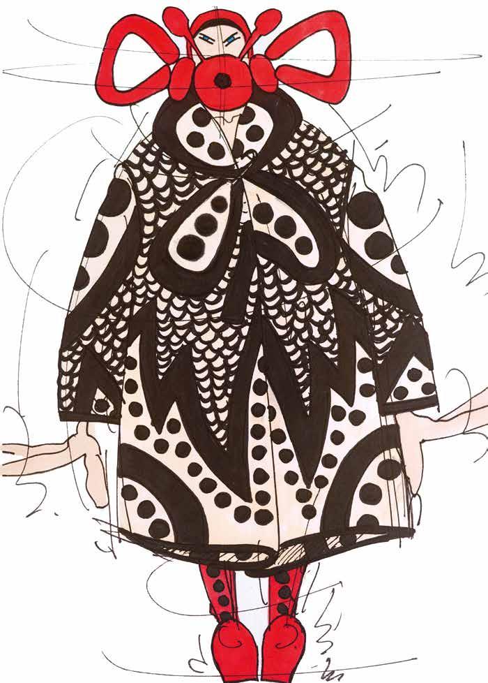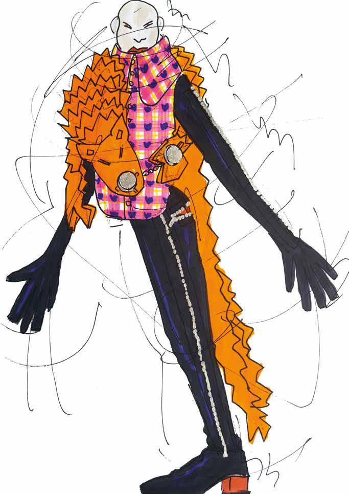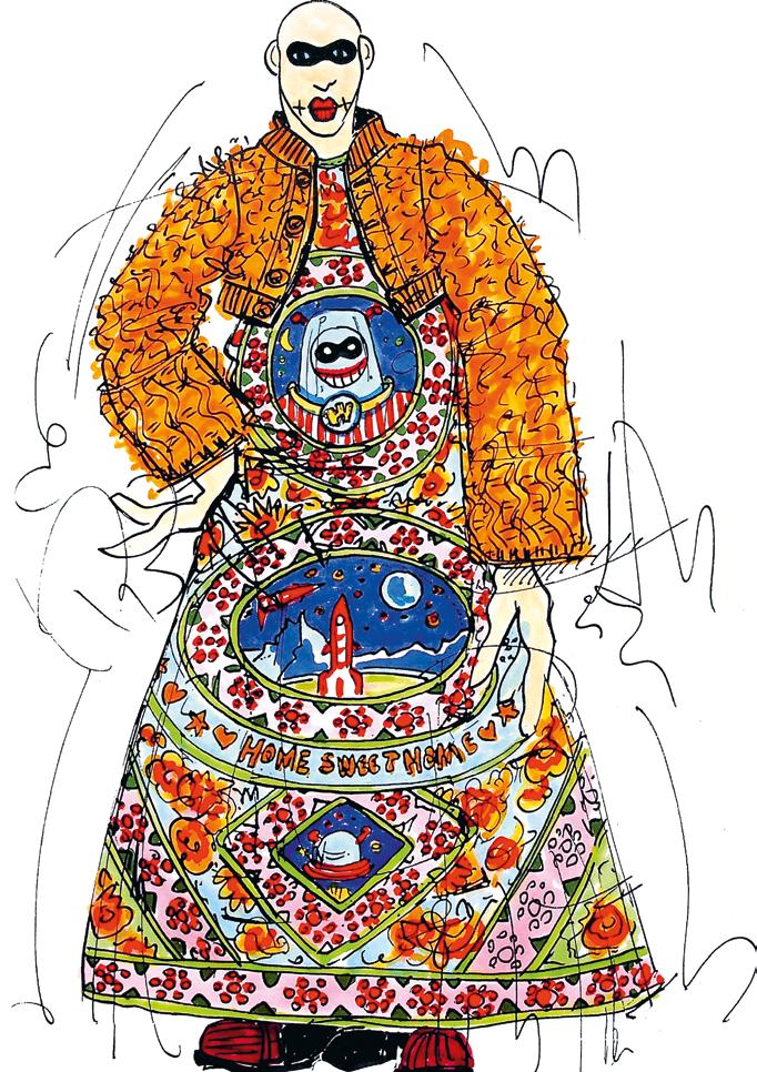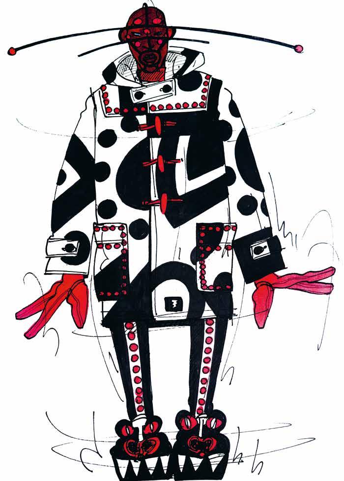 years I was working on W.&L.T., and I did those big shows and worked with a larger team than I do now and I’d outsource a lot of drawing work to others. It surprised me that I produced such a large number of the base drawings that showcased the full looks. That’s mostly the case for the WELCOME LITTLE STRANGER and MEN IN BLACK (UFO) collections. I didn’t remember drawing those looks with the helmets and wigs, but I still found them by looking for them a second time. They were in black and white, and I initially said I wouldn’t pick out black-and-white sketches for this book. So, that was a surprising feeling, finding those drawings from the 90s even though my design process was almost completely different then. I was doing the designing myself but there were many other people adding to the process. I was also thrilled looking at those pencil drawings in the sketchbooks, seeing how detailed they were. The styling with the bowler hats and caps on top. The gnomes in LET’S TELL A FAIRYTALE, seeing the skirts and the fact that there was already a certain fluidity in those drawings. There’s a feeling there that I’ve been putting into my collections since the beginning. That’s nice to see.”
