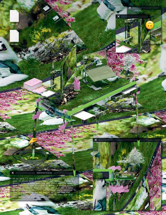 The previous scene of chaotic clutter is replaced by a rendering of calm and order: pens and scissors sit neatly in their designated places, while a pad, a Bible, and a notebook are carefully arranged. The backdrop for the desktop, and for the overall image, is a photo of a dog resting under cherry blossoms. A text file declares, with serene clarity, “I like to keep the desk very attractive and pleasant looking.” This glimpse into a creative mind suggests studiousness and responsible virtue. While playful and idealized, this scene, paired with its