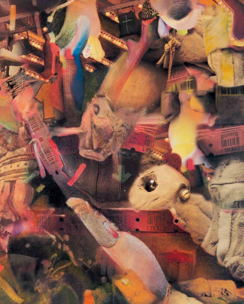 This drawing presents a seemingly limitless clash of form, color, and figure, suspended without an apparent ground or clear vantage point. Elements from various scales and contexts—such as a bird’s eye, a soffit filled with lights, and a barcoded ticket string—emerge in the abstraction, providing fleeting glimpses of the familiar. Yet, the image remains unsettled, deliberately refusing any cohesive interpretation. Lines and shadows weave through the scene, offering hints of continuity, but ambiguity prevails. The composition recalls the intricate,