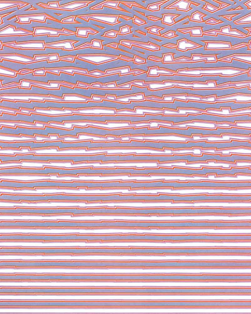This drawing is comprised of thirty-two striped, offset colored bars arranged horizontally. Initially stable and orderly, by the seventh, a subtle vibration disrupts the sequence. By the twentieth, the bars have dissolved into eighteen rectangles, aligned along a central axis and rotated. By the final row, the rectangles swing freely, untethered from one another. This transition from structured stripes to fragmented rectangles suggests a formal evolution from stability to instability. The color scheme enhances the part-to-whole relationship, with the