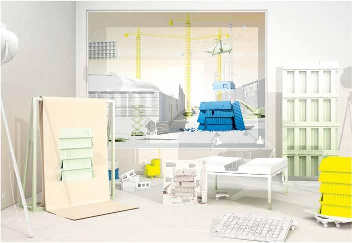 If the previous image was explicitly about space, this second image presents another kind of performance, seen primarily through the lens of time. Different moments in the lifecycle of a relic are on display. In the foreground, a conceptual rendering and a material mockup gesture at this structure’s ideal state, either at its inception or in its future condition. Meanwhile, a drawing is labeled with instructions for the care of the fragile monument through a window, a helicopter is holding a piece in midair. The direction of time’s arrow is ambiguous—are we
