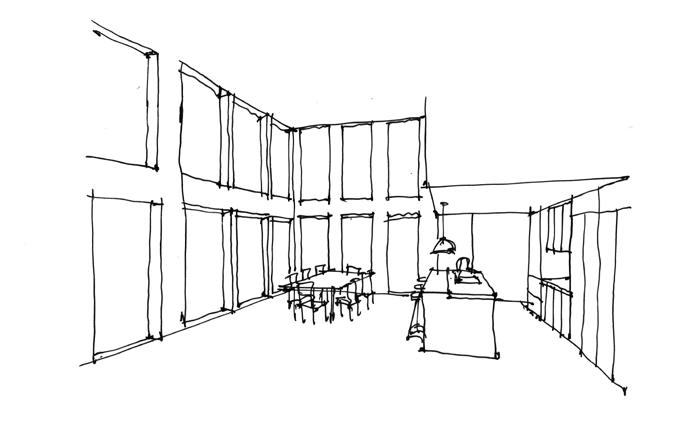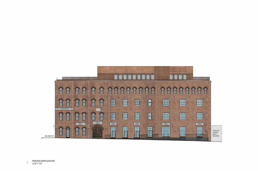 On the interior, the layouts reference the major historic divisions of the sections of the building, and historic materials and finishes will be exposed and restored. A new metal ceiling replicates the historic pattern, original columns remain exposed, and the vaulted cellars will be preserved. The bright and open upper levels will have a distinct focus on materiality and texture while the lower commercial levels strive for an atmosphere of timelessness by putting a focus on the solid brick masonry of the existing building.