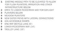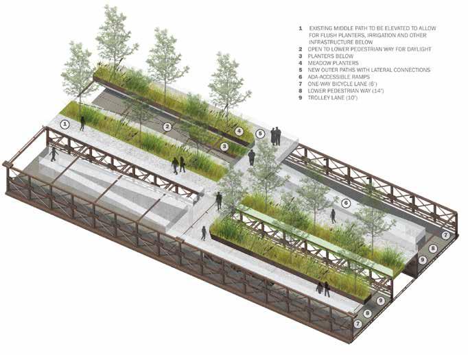 Expansion of the bridge’s upper deck and its strategic perforation to provide natural light to the lower deck permits the introduction of linear planters comprised of seasonally expressive sequences of dynamic landscape plants. Planters are recessed into the deck where possible and assist with the management of bridge runoff. The plantings are comprised of colorful matrices of grasses, wildflowers and woody plants drawn from local ecologies like the coastal plain, riparian corridors and upland meadows—rich communities with compelling arrays of flowers, foliage, fruit and form that, when woven creatively, engage visitors, birds, and pollinators alike.