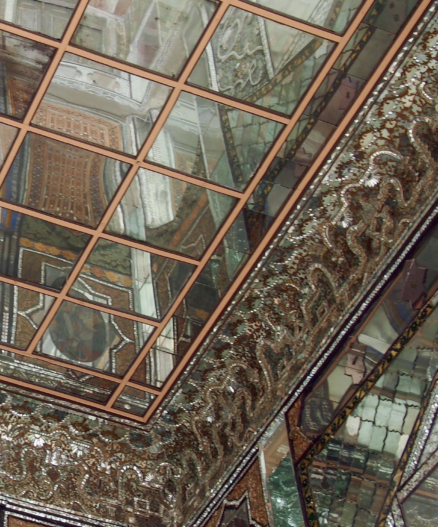 During the Qajar period of the 18th and 19th centuries, mirrors played major roles in architectural embellishment. Here, for instance, the Golestan Palace in Tehran confounds with the multiplying illusions of its mirrored walls and ceilings. For their own residences, wealthy merchants of the time introduced mirrors into embrasures of white stucco, as though they were windows. In turn, these reflect actual windows and their colored glass, often arranged in tile-like patterns and sometimes studded with miniature mirrors.