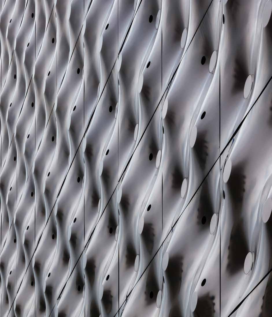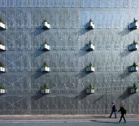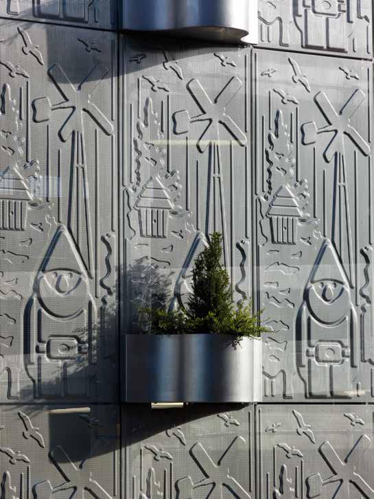 The striking facade of the garage consists of perforated panels specially developed in collaboration with a producer from the automobile industry and a facade construction firm. Figures of birds, windmills, garden gnomes and birdhouses, all distinctive images of the Province of Flevoland and the city of Almere, were pressed out of the perforated facade panels using vacuum forming technology. The surface relief created by the pressed figures on the panels lends the garage the appearance of a cheerful-looking giant tin can. Since the facade panels act as veils, the garage interior is flooded with daylight. This also creates a sense of community safety and pleasant natural ventilation in the garage. In the evening hours the facade acts as a luminous object that further enhances community safety in the immediate surroundings.