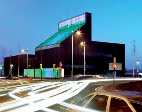 The 25 cm thick concrete walls, dark gray inside and outside with a folded metal sheet texture, becomes a structural skin. The boiler room has a light roof designed with corrugated polycarbonate sheets where, under each wave, a RGB LED rail is placed. A lighting control that generates images transform the roof into a low-resolution media façade. This large 20x20-meter video surface is completed with another at ground level (4 meters high and 30 meters long) with the same characteristics.