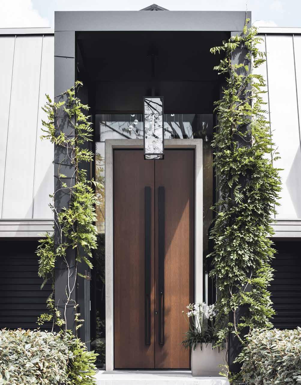 The effect of the pergola is softened at the front by white bougainvillea, potted ornamental grasses and citrus trees. We kept the pots simple to maintain a sense of calm and arranged a pair of minimalistic water features on either side of the door to add symmetry. In terms of lighting, the Costa lamp echoes the strong lines of the pergola.