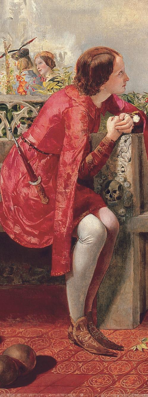 What’s remarkable is that in both images Cesario wears male attire, dressed as a page boy with tunic over tights, in garments borrowed—perhaps literally—from a stage-costume box. Such boyish outfits were worn by young ingénue performers with shapely legs to please theatre audiences. Offstage, women always wore long skirts. Siddal’s willingness to pose wearing tights seems eloquent of her liking for studio life. She evidently then agreed or volunteered to pose for Deverell’s friends.