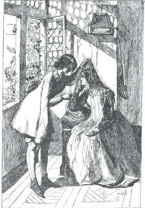 to have had higher aspirations towards fine art, and possibly saw more potential in the studios, agreeing or even offering to pose for Walter. He had been over-ambitious in creating a multifigure scene from Twelfth Night, destined for the next summer exhibition at the Royal Academy. The modelling sessions took place in December 1849, either in the School of Design, where Walter taught alongside his father, or in the Deverell home. Lizzie took at least two poses—one profile pose listening as Count Orsino laments his love for the Lady Olivia, and one raising Olivia’s veil, as Cesario woos as Orsino’s messenger. The first was painted on to the large canvas, the second transformed into an etching for the PRB magazine The Germ. The first gives an accurate rendering of Siddal’s pale, translucent skin and bright auburn hair (pictorially cut short); the second, in the words of William Rossetti ‘does not give much idea, but is not unlike her in a way…’