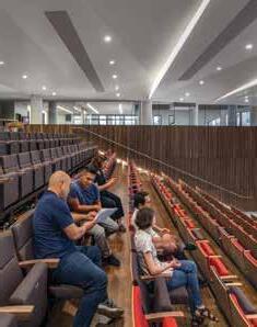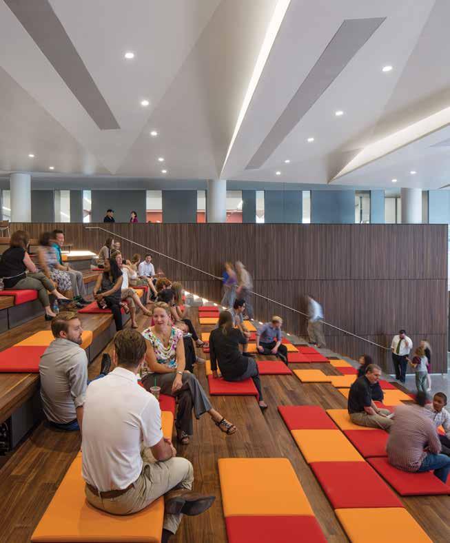 Unlike traditional retractable seating, where the chairs and tiered platforms are attached and both are retracted together, the design team developed a motorized “tray” system that allows for each row of auditorium chairs to be deployed independently and concealed within individual tiers. When the chairs are in their retracted position, the tiered array of wood steps provides a unique social space and an interior landscape that encourages interaction.