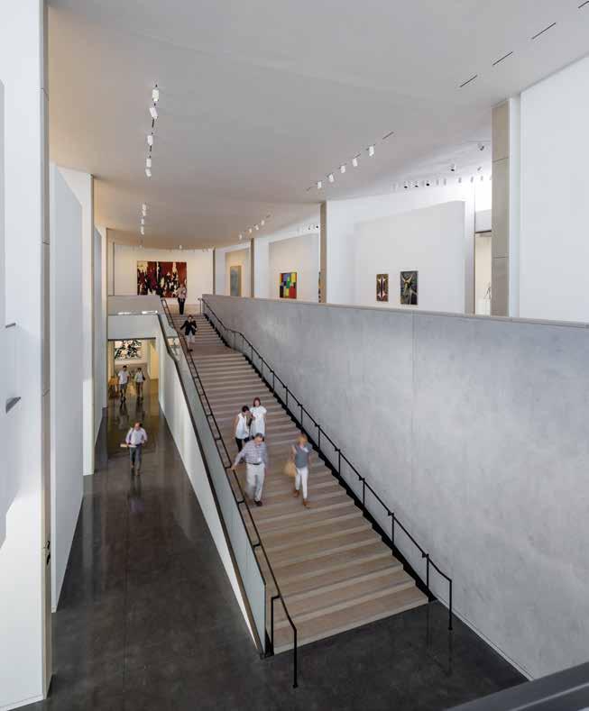 The main stair hall at the Anderson Collection has been carefully calibrated to perform a number of important functions. First, it must bring the visitor up fifteen feet to the gallery level. Therefore it has been attenuated to be as gentle and gracious as possible, a promenade architecturale that enhances the experience of accessing the gallery level. By using very low risers and longer treads than are typical, the stair provides a graceful, gradual ascent to the gallery level, so that one does not notice the substantial distance that it traverses.