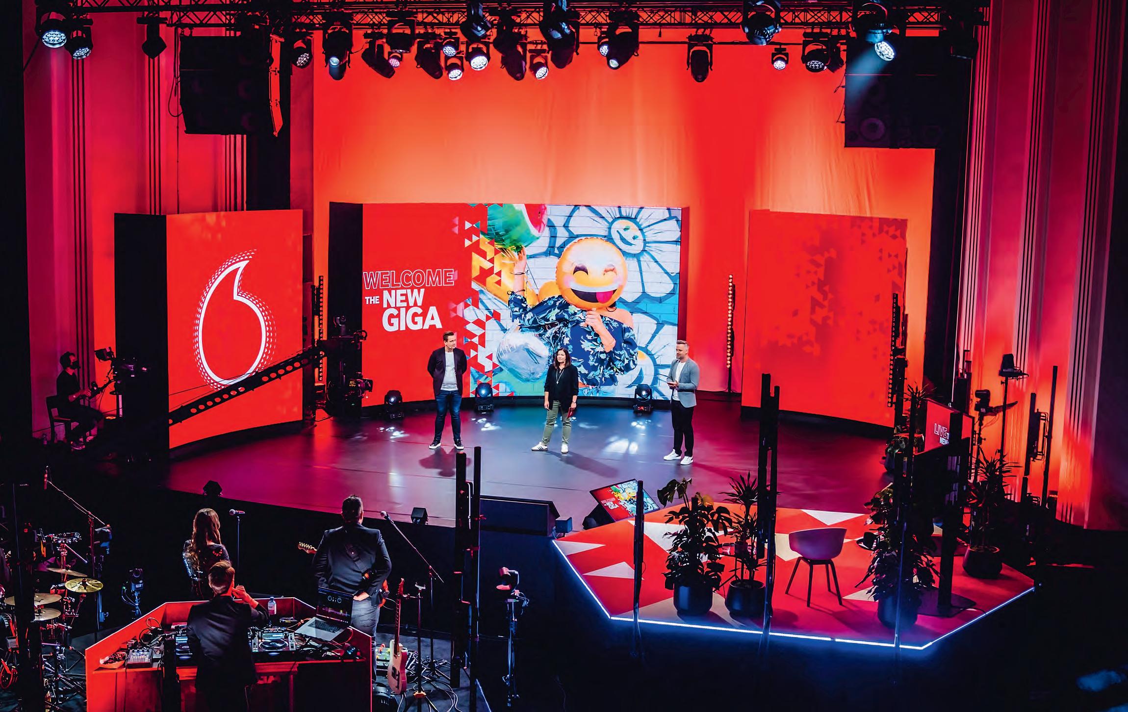 In 2022 the Vodafone kick-off event was streamed for the second time from Lichtburg Essen, Germany’s largest film palace. Under the motto “Live the new Giga”, the focus was on bringing the previously internally introduced new strategy to life. The aim was to underline the central role of employees at the company and to motivate them in this respect.