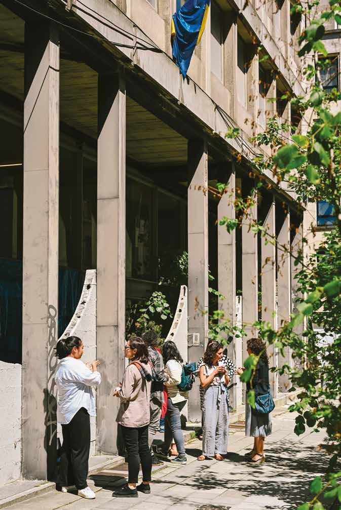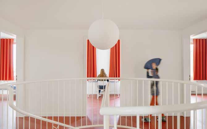 van de studio’s erboven, en richt zich eveneens vol op de tuin. Een niet te missen wenteltrap in het midden van het gebouw verbindt de twee bouwlagen – misschien nog wel meer als sculptuur of als medium voor licht en geluid in de gedeelde kern van het gebouw dan in de functionele zin. Enigszins verscholen tussen de centrale traphal en de leefruimtes bevinden zich nog een ruime gedeelde badkamer, een wasruimte en berging, een lift en een minder ceremoniële trap naar de kelder. Met zijn grote oppervlakte en robuuste materialisatie lijkt die laatste haast te smeken om een stiekem feestje, een stevig tafeltennistoernooi of een bank om in te hangen – als informele tegenhanger van de leefruimte.