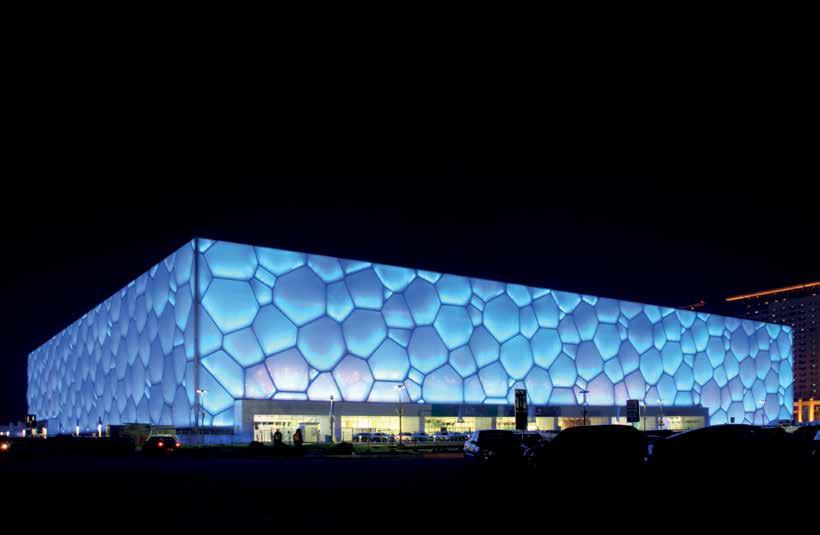 The Beijing National Aquatics Center, commonly known as the Water Cube, was conceptualized as a cubic container filled with a cellular structure of bubbles representing foaming water. As a metaphoric overlay of the square (an important symbol in Chinese culture) with the aquatic program it was intended to house, the 70,000 m2 project was built as a venue to support swimming, diving, and water polo competitions held during the 2008 Olympics. The Water Cube’s thickened architectural envelope, which also functions as the structure for the building, is derived from the natural three-dimensional pattern of soap film that forms as an interface between gas bubbles suspended in a foaming liquid. This cellular pattern is considered to be the most efficient structural subdivision of space common to cellular phenomena found in nature and was the basis of Joseph Plateau’s and Lord Kelvin’s historic models studying aggregate soap bubble geometries. In the early 1990s, the computer simulations of Denis Weaire and Robert Phelan provided an improved solution to these earlier investigations, advancing a polyhedral geometry comprised of two cell types of equal volume—six tetradodecahedrons and two dodecahedrons—packed in a regularly repeating pattern, a variation of which was used to generate the cellular structural lattice for the Water Cube. This spatial topology is used to uniformly fill the volume, which is then carved away to provide the requisite space for the interior program. To achieve the perceived complexity, heterogeneity and irregularity of an aggregate of natural bubbles, the adjusted Weaire-Phelan polyhedral geometry was rotated in relation to the Cartesian orientation of the cube so that the skewed section of the structure, as it is revealed through the continuous series of planar surfaces forming the walls and roof, would operate to conceal the regularity of the cellular geometry. An iterative structural optimization script was then used to size all of the steel members and connections comprising the cellular lattice, which is made up of steel tubes welded to spherical nodes. The building structure is clad in an envelope of 4,000 inflated ETFE pillows—a secondary skin of bubble wrap, which, as a complement to the structure, is transparent, lightweight, and composed primarily of air. This combination of structure and cladding eliminates the need for a secondary structural system to support the envelope while operating as an insulated greenhouse that diffuses natural light throughout the space.